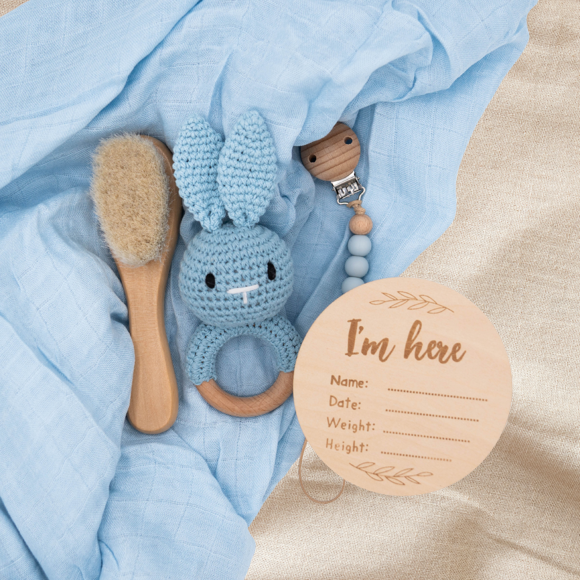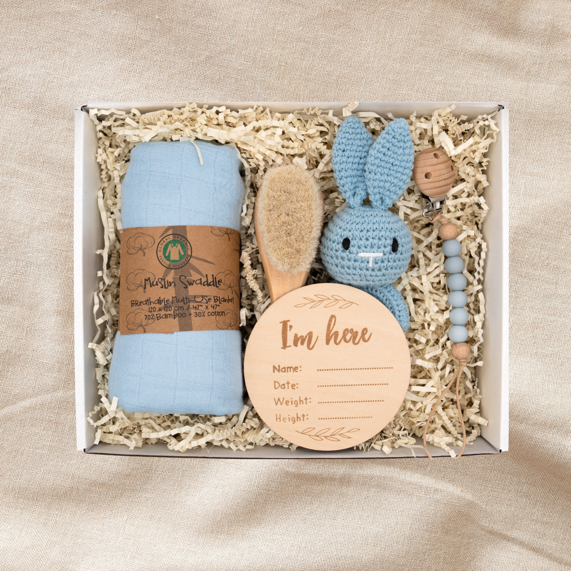 A sweet and thoughtful newborn gift set designed to welcome baby with warmth and comfort. Curated with soft textures, natural materials, and gentle essentials, this box is perfect for baby showers, gender reveals, or a first-visit gift. Beautifully packaged with blue bow and ready to gift straight out of the box.